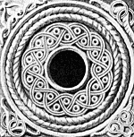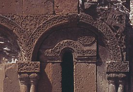 The dome and the whole of the south-western section of the church had collapsed by the end of the nineteenth century. In 1988 an earthquake destroyed the south-eastern corner of the church. Zak'aria's inscription, mentioned earlier, had been inscribed onto this section of the wall. Also on this part of the church there were two circular windows with ornate frames. The drawing, above left, is by Arshak Fetvadjian and depicts the lower circular window. (NB: under current Turkish army restrictions, visitors to Ani cannot visit the Kizkale peninsula. The peninsula also lies outside the wire-mesh fence that surrounds most of Ani.) | ![]() |