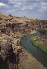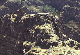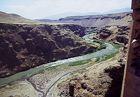 "It takes about two hours to walk here from the city walls, but it is a journey worth making. This is partly because of the views, which are stunning. Partly also because I think here - more than in any other part of Ani - you get a sense of the tens of thousands, hundreds of thousands, of people that once lived here. You know that they would have walked along the same path as you did to get up here; that they sweated over the same slopes, stumbled over the same boulders. And when they finally got up here they probably sat in the same spot as I am sitting, looking out over the same view, listening to the river in the gorge below, with the water flowing over the rocks and the birds singing in the bushes. And, for a while, the people who built this city seem very close." - Lines from the video "Journey Through Western Armenia" At the southern end of Ani, south of the citadel hill, the site narrows into a dramatic promontory that is almost encircled by the Arpa / Akhurian river and is protected by near vertical cliffs. The flat top of this promontory was once a separate fortified enclosure. This may have been one of the last parts of Ani to be abandoned because the foundations of the houses are better preserved here than in the rest of the city. This part of Ani is now known by the Turkish name Kizkale, the "Maiden's Castle". Its only known Armenian names have the same meaning: Kuysiamrots (Virgin's Castle) or Kusanats (Virgins' Castle).According to tradition, before Armenia's conversion to Christianity a pagan temple dedicated to the goddess Anahit stood here. This temple was destroyed by Saint Gregory the Illuminator, who then erected a church on the site. There is, however, no actual historical or archaeological evidence to substantiate this tradition, and it was probably an invention by the inhabitants of Ani to add prestige to their city. The Kizkale site has never been excavated; Artashes Vruyr humorously wrote that Marr chose to keep it in its virginal state. The summit can be reached by either one of two difficult paths that wind their way around each side of the promontory. The path along the side overlooking the Akhurian river was probably the original approach because it is guarded by a now ruined gateway.This part of Ani is now very rarely visited, even during the few years in the 1990s when the Turkish military allowed it. However, during the Russian period Kizkale must have been a popular spot for visitors - there is lots of Russian and Armenian graffiti on the church's walls. The panoramic vista from here back over the city is extremely impressive, as are the views along the river that forms the border between Turkey and the Republic of Armenia. The Kizkale Church
