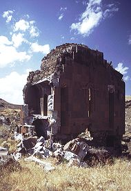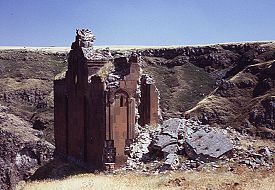 At the very edge of the precipitous cliff stands a ruined church, probably built during the first 15 years of the thirteenth century. The Zak'aria (also spelt Zak'are) that is mentioned in the above inscription was the governor of Ani on behalf of the Georgians from the year 1198/1199.
