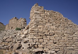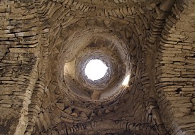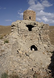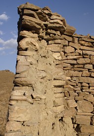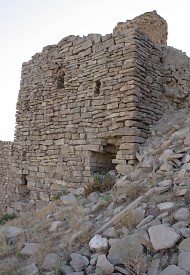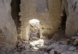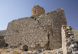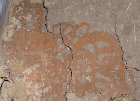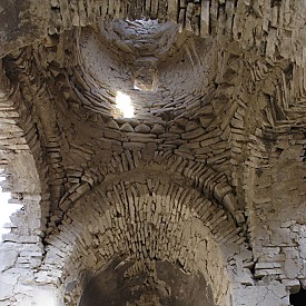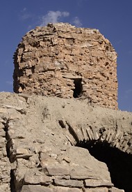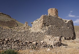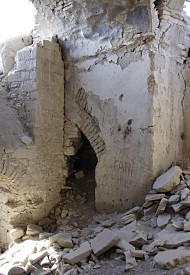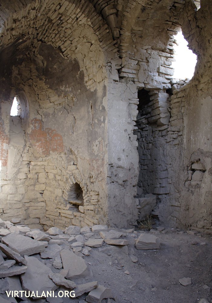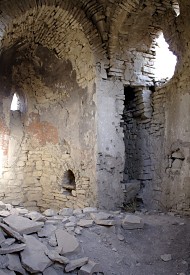 The apse is particularly deep and is lit by a single window. This window is quite large for the period - probably a wider than usual aperture was acceptable because on the outside the window is located high above the ground level. There is a small and crudely shaped niche in the southern side of the apse. The apse, along with most of the interior of the church, has originally been plastered. On surviving plaster on both sides of the apse window there are a series markings (see photograph 16). They are little more than very crude daubs in a red paint, and appear to depict a series of crosses inside circles, often overlapping each other. It is unclear whether they are original, or are just graffiti that post-dates the abandonment of the monastery. The apse is flanked by long, narrow side chambers on two levels, with each chamber being lit by a small window in the east façade. At some point the domed-hall plan was altered and the two bays that opened onto the western arm were filled in (see photograph 18). This appears to have coincided with a reconstruction of the entire west wall of the church. The current off-axis entrance, and the window above it, is not original. This alteration and reconstruction may have been as a result of the 1648 earthquake. Thierry noted a blocked-up doorway in the southern bay, but it is no longer visible due to fallen masonry. The vaults of the filled-in bays were constructed using mud bricks. On the south façade of the church, loss of masonry has revealed the southeast corner of an earlier wall - a wall made of mud brick (see photograph 9). This corner is located about one metre in from the present southeast corner. Either the entire eastern part of the church has been lengthened at some point in time, or the church originally had shorter side chambers and an apse that protruded out from the line of the east façade. Again, this alteration may have been as a result of the 1648 earthquake. Other Buildings