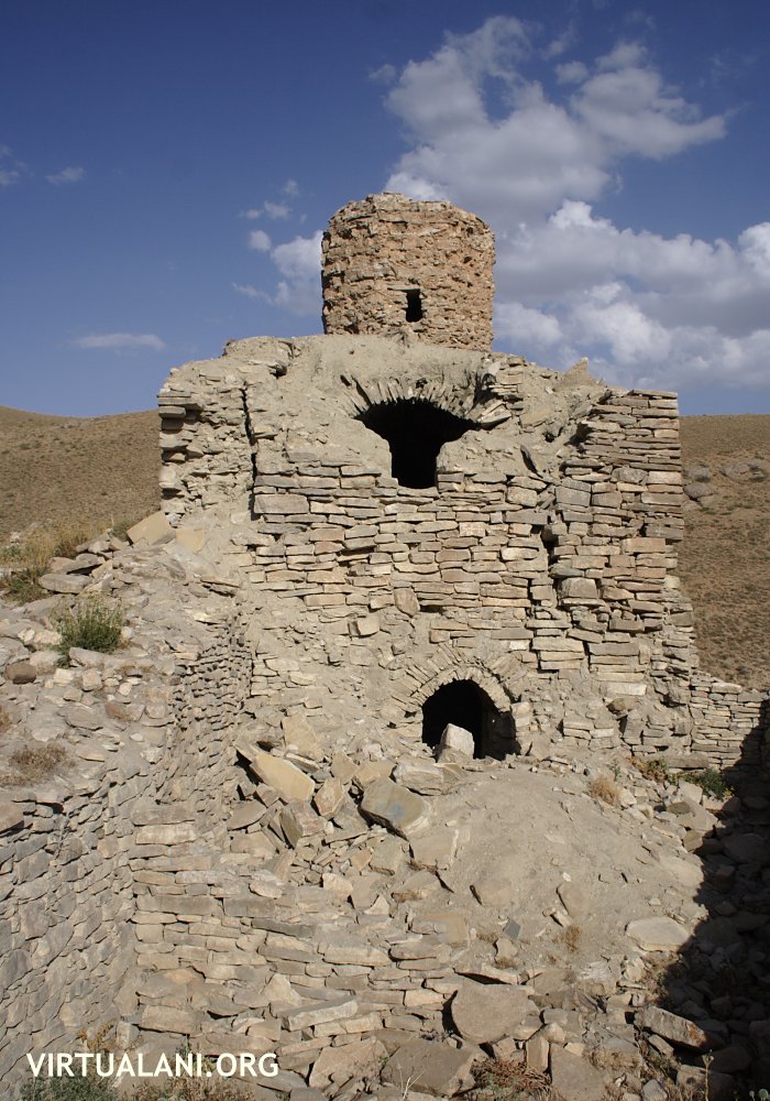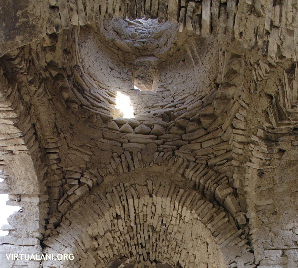 The church, "B" on the plan, has a "domed hall" plan. Above the central square is a tall drum with a dome whose apex has collapsed. The drum is cylindrical on the inside, octagonal on the outside, and is pierced by four windows. One of the windows has a reused gravestone as its lintel. The exterior of the drum appears to have been originally faced with cut stone blocks that have now been robbed-out. The rest of the church had a flat, earthen roof.