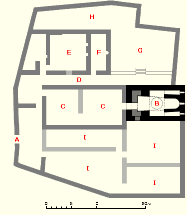 To the west of the church is a rectangular chamber, room "C" on the plan, which is partially divided by a crudely-built wall. This room may have served as a jamatoun and was probably originally roofed with wood. To the north of this chamber is a passageway, "D", that gave access to a row of three rooms that are now roofless. Thierry noted that room "F" had what appeared to be an oven in its east wall. He postulated that room "F" may have served as the kitchen and room "E", which has several niches in its walls, might have been the refectory. The possible oven in room "F" is no longer visible, nor is the wall with steps that bounded area "G" - an area Thierry called a small garden. Thierry included the area marked "H" as part of that garden. However, there is a row of postholes along the length of the inner face of the north wall, indicating that a structure of some sort must have been located in area "H". At the southern side of the site are four enclosed areas, marked "I" on the plan. The walls of these enclosures are much cruder than elsewhere in the monastery: some or all of them may be sheepfolds that date from after the monastery's abandonment.