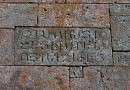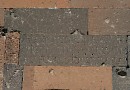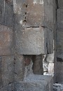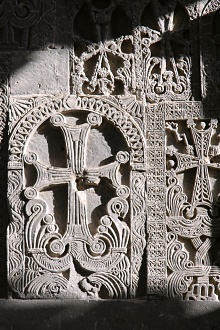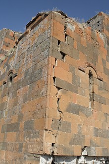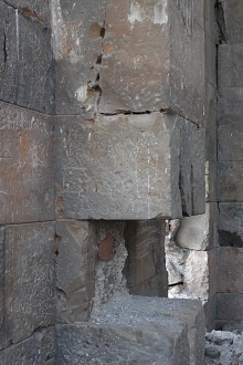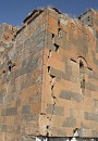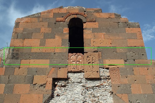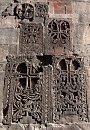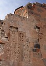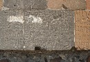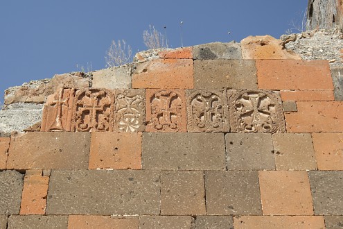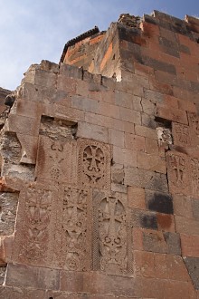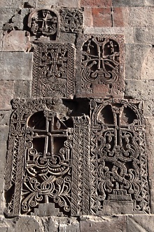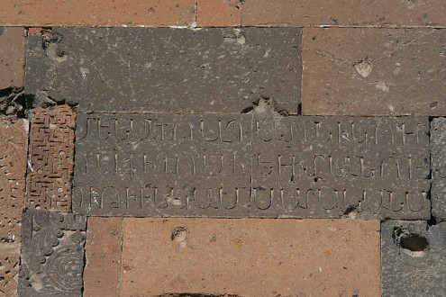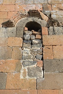 There are areas of extensive patching to the original masonry on the west and south facades. This reconstruction, which is from not later than 1251 (the date of an inscription on a repaired section), reused many khachkars (see photographs 30 and 41 to 44). When counted at the start of the 20th century, there were a total of 35 khachkars on the south facade, inside and outside, and 16 on the west facade. Many of them were trimmed slightly to fit their new use. Stylistically, they seem to date from the 10th to the 13th centuries, with khachkars from different periods mixed up together. Amongst the reused khachkars, Samvel Karapetian identified two fragments of what may have been a early Christian stele - one of the fragments is located high up on the left side of the west facade, the other fragment was on the now destroyed south facade.
