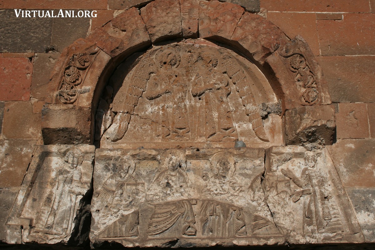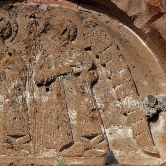 The tympanum, cut from a single block of tufa, is filled almost entirely by a depiction of two winged angels carved in bas-relief. They stand side-by-side, facing outward, their left and right shoulders almost touching. Their heads have halos and their full-length wings are particularly elaborately rendered with horizontal rows of feathers. Each holds in their left hand a disk-like orb inscribed with an equal-armed cross [note 8], with the index finger of their right hand pointing to the orb. Though barely discernable from the drapery folds, each also appears to be holding in the palm of their right hand a sceptre that is held diagonally, crossing their right shoulder. Carved into the flat surface underneath the arch of their wings are worn inscriptions in Armenian identifying the figures as the Archangels Michael and Gabriel.