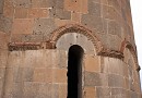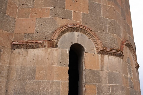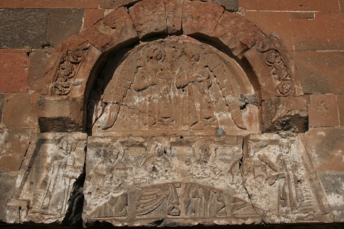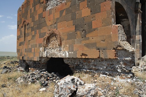 The exterior walls are mostly plain in appearance but are enlivened by the rich tones of its facing stone that range from dark brown to rose red. There is sculptural decoration at various locations, in particular over the west and north entrances (this sculpture will be described in detail later). Large sections of the original stone facing on the south and west façades were reconstructed at a later period and into those newer sections have been embedded an impressive selection of ornate khachkars. Much of the lower courses of the facing stone have been robbed out, undermining the walls of the church.