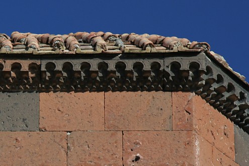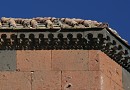 The cornice of the drum is incised with a row of horseshoe arches on a base of two dogtooth friezes - a form often seen on 7th century Armenian churches. Old photographs reveal that there was a similar and mostly intact cornice on the roof over the aisle and transepts, but it has now entirely vanished. The various sections of the church's roof would have been covered in clay tiles, but the only parts that now survive are the tiles on the roof of the dome. There is nothing to suggest that this is not the original 7th-century roofing. Kalantar saw a similarity in the shape of the roof tiles at Mren with tiles he found scattered around the ruins of the St. Theodore church in nearby Bagaran (modern Kilittaşı, a little to the south of Mren). The St. Theodore church (which is now completely destroyed) was founded in "the thirty-fourth year of King Khosrov" (which equates to 622-623) and completed in 629 according to Timothy Greenwood's reading of its foundation inscription.