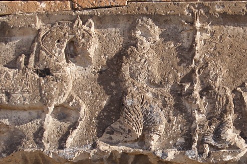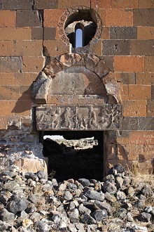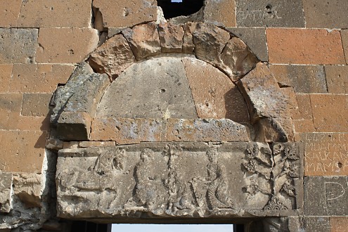The tympanum is framed with a hooded arch. On the face of the arch is carved a vine-scroll frieze in which bunches of grapes and vine leafs alternate within a sinuous vine stock. Ornamental motifs with grape vines were widespread throughout the Late Roman / Sassanid period, but the motif acquired renewed significance as a Christian symbol [note 9]. The bunches of grapes on the Mren church have a distinctive three-segment form; similar carvings of three-segment bunches of grapes are found on the Ozdun basilica. Above the hooded arch is a fragment of more sculpture: a small section of an arc survives, probably part of the frame of a porthole window similar to the surviving porthole window on the north facade.