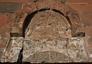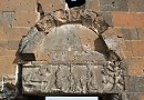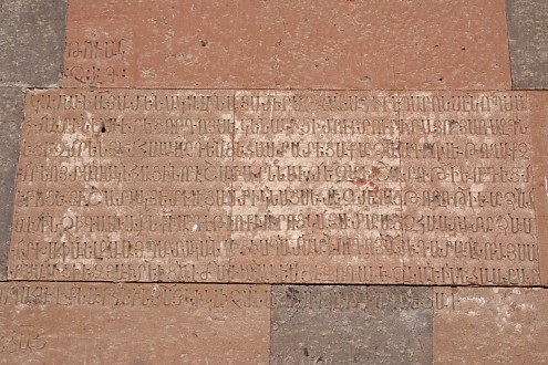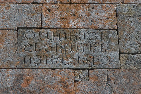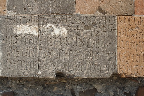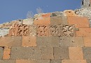 High up on the west façade of the church, directly under the nave window, is a dedicatory inscription extending across almost the full width of the gable (see photographs 13 and 14). Written in Armenian, it comprises three lines of text carved into a row of adjoining slabs of facing stone. Parts of the west façade suffered damage at some point in time and have been reconstructed - so there are some gaps in the inscription where original stones have been replaced by newer ones. The inscription [note 1], with its missing words and letters in square brackets, reads: