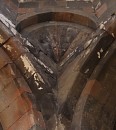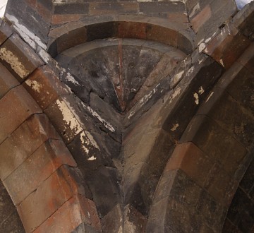 The drum of the dome is octagonal inside and outside, and the transition from the square bay is accomplished using half-conical squinches. Eight smaller squinches join the drum to the vault of the dome. The dome is reinforced and articulated by eight ribs, the ends of which rest on small imposts. Four large windows pierce the drum (see photographs 11, 21, 22).