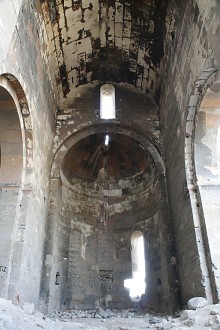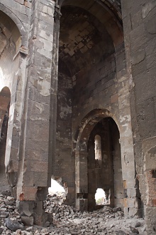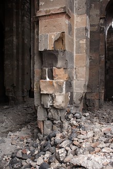 7. It is difficult to be certain about such damage. However, at Mren, damage that does not seem due to the looting of stone for building materials or to treasure hunting includes the removal of the the roof cornice (to enable water penetration), the removal of facing stones from the base of the facades, the removal of structurally important masonry from interior pilasters and piers, and the removal of masonry from parts of the drum of the dome. The complete removal of all traces of the two chapels and Sahmadin's portal is also unlikely to have occured as a result of stones being taken for building materals.