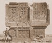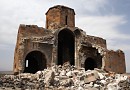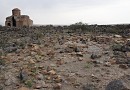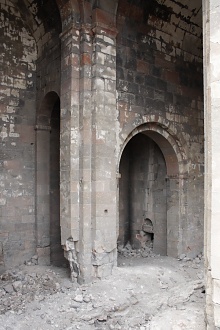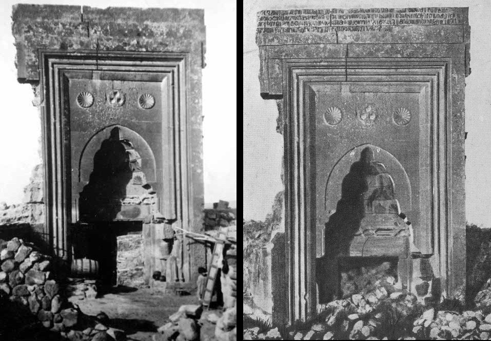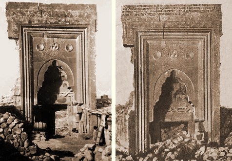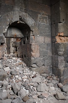 The portal was still intact when seen by Kalantar in 1920. It is now completely destroyed and, except for a few small fragments, all of its masonry has been removed from the site. To the east of the domed church was a small chapel dating from 1277 that was built (or restored) by Sahmadin. A photograph exists of it, taken in 1890. A description from 1878 mentions beautiful khachkars carved on its walls and a tombstone in front of its doorway [note 11]. The same description mentions a second chapel located to the east of the domed church and surrounded by ruins - it had three doors and an inscription on an arch above one of the doors was dated 1301. Both chapels no longer survive and, like the palace doorway, all of their masonry together with their concrete core has been removed from the site.