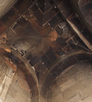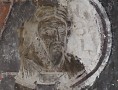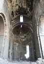 Much (perhaps all) of the interior was originally plastered and probably also frescoed. Only a few damaged fresco fragments remain in the apse. They are believed to be from the 6th or 7th century. The inside of the quarter-dome vault of the apse has the very fragmentary remains of a fresco of a seated Christ. On the inside edge of this vault is part of a row of medallions containing the busts of male figures, probably prophets (see photograph 24). Along the extrados of the apse's quarter dome are fragments of a painted inscription in Armenian. There is a full-length figure (an Apostle?) on each of the four surfaces between the apse windows, and another full-length figure, perhaps a bishop, is visible on the north wall of the east arm. A small fragment of fresco also survives on one of the piers supporting the dome, indicating that the fresco paintings were not confined to just the apse.