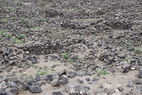 Around the domed church is a dense cluster of ruined buildings, part of the settlement of Mren. Mren's urban layout appears to have been very irregular, almost village-like, and split into a number of distinct districts. The majority of the buildings are simple in form: single story and single chamber structures constructed of rough basalt boulders. Stone robbing may account for the complete lack of surviving ashlar masonry amongst the buildings, but the quantity of cut stone must have always been small. The approaches to Mren have fields bordered by low stone walls and with lanes running between those walls - these are probably the remains of the gardens and vineyards mentioned in medieval accounts. Except for the (probably late) fortified wall around the church, the settlement area of Mren appears to have been undefended. In the RAA periodical Vardzqpogr [note 13], Samvel Karapetian, using satelite imagery, postulates that two other ruined structures visible at Mren might be churches - however, both the structures are not churches (they are probably small caravanserais).