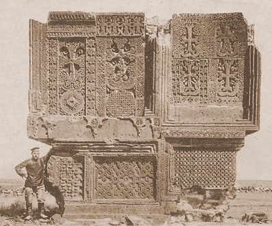 10. It is possible that from this tradition evolved the monumental stone steles that were found in Armenia before the period of the Arab conquests. These steles, which probably had either votive or memorial functions, typically stood on stepped pedestals and were composed of short columns, generally rectangular in section, with capitals surmounted by stone crosses.