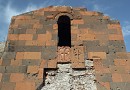 The donation of a vineyard at Mren is mentioned in the foundation inscription of Ani's Tigran Honents church, and yet another Mren vineyard donation is recorded on the walls of the Surp Sarkis church at Khtzkonk. In 1272 Mren's governor, Artashir, the son of Shahanshah II of Ani, sold the town to a certain Sahmadin who, in 1276, constructed in Mren a summer palace with gardens. In 1277 the same Sahmadin restored the Redeemer's chapel in Mren. A donation inscription dated 1320 on the south facade of the domed church indicates that it was still in use at the start of the 14th century (this inscription, no longer extant, was recorded by Nikolai Marr). After that date its history, and that of the settlement of Mren, is unknown. At some point the church was converted into a fortified position - some of the windows and doors were blocked up (see photograph 40) and the exterior roof levels at the four corners of the church were raised. Old photographs reveal similar defensive modifications on many large churches in the Shirak region [note 5]. A low circuit of walls with towers also surrounds the church (partly visible in photograph 9), forming a compact enclosure - the space between this defensive wall and the sides of the church is only some 10 metres wide.