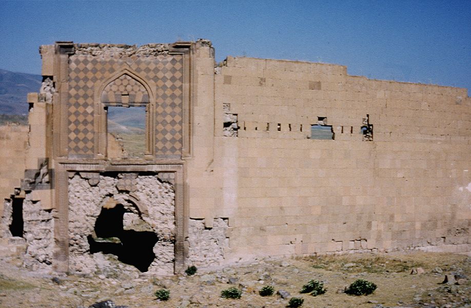 Design AnalysisOn the city side the surviving structure is two storeys high. From the entrance, one enters a rectangular room, then into a large courtyard (probably originally roofed over) surrounded by rooms, probably reception rooms and private apartments.Post-holes set into the walls reveal that much of the upper stories were wooden. The palace walls that overlooked the Tsaghkotsadzor / Alaca Çay valley also formed part of the city walls.![]() The ground level steps down sharply at the rear, allowing for an extensive basement level. This is roofed with stone vaults and is a labyrinth of rooms and narrow corridors - narrow, tall, and mostly unlit. The whole basement was probably intended only for storage, supporting the theory that this was a merchant's house. ![]() The Palace GatewayThe imposing, sumptuously decorated, gateway in the eastern facade is the most remarkable part of this building.It is divided into two sections and set between completely plain walls. The lower section comprises an arched entrance inserted into an richly inlaid panel where eight pointed stars of pink stone alternate with crosses of grey stone. Both stars and crosses are incised with intricate decorations. Most of these stone inlays have vanished - H. F. B. Lynch, writing at the end of the 19th century, tells of how patriotic Armenians, erroneously assuming that this was the palace of the Bagratid's, would prise them off and take them away as souvenirs. Several of them fell off during the 1989 earthquake, and were later stolen. The upper level of the gateway facade is plainer. A large rectangular opening is set into an inlaid panel of light and dark stone lozenges. This opening, perhaps a ceremonial window, is framed within an ogee arch (a motif found in Moslem art). The tympanum under this arch has an inlay of hexagonal polychrome stone. The 1999 "Restoration"The southern walls of the palace had mostly fallen by the end of the 19th century, revealing the vaults of the basement. In the early 1990s these were partly rebuilt in a badly executed "restoration" that destroyed much of the original fabric and used stone that was entirely different in size, colour and quality from the original.However bad that work was, it was as nothing compared to the hideously ugly "restoration" started in 1999. Following faithfully in the tradition of Turkish restorations at Ani and elsewhere, there is now far more new masonry in the Palace than original masonry! The new stonework does not match the old in either colour or finish, and there is no archaeological evidence to show that the rebuilt walls originally looked like this. The work continued into the following year, with the rebuilding of the entrance gateway. This involved the removal of all the remaining stars and crosses inlays and their replacement by crude, undecorated copies. See 'The Rape of Ani' for a more detailed account of the destruction. All this work goes completely against against the established techniques of modern archaeological conservation practiced elsewhere in the world. | ![]() |