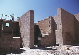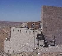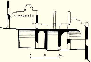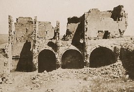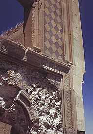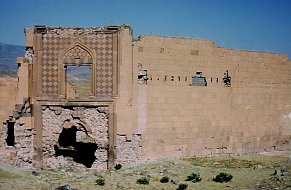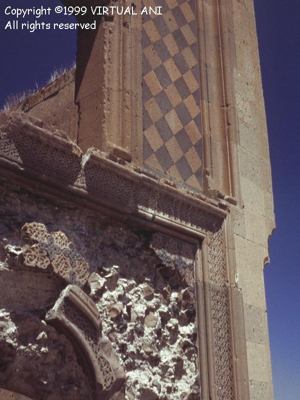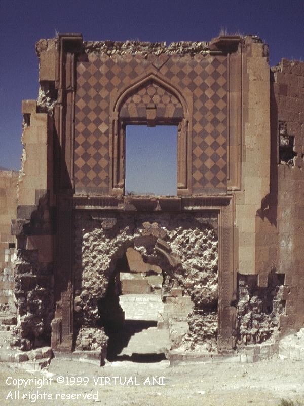 Bu sayfadaki saray plan ve kesiti, Profesör Beyhan Karamağaralı'nın yayınlanmış mesaha çizimlerinden uyarlanmıştır. Sarayın GirişiDoğu cephesinin heybetli, muhteşem bir şekilde süslenmiş girişi, bu yapının en dikkate değer kısmıdır. İki bölmeye ayrılmıştır ve tamamen sade duvarlar arasına yerleştirilmiştir. Alt bölmesi, bir kemerli girişin yerleştirildiği, pembe taştan kesilmiş sekiz uçlu yıldızların gri taştan yapma haçlarla değişimli olarak zengince işlendiği bir ayna içerir. Yıldızlar da haçlar da, karmaşık süslerle hakkedilmiştir. Bu kakma işinin çoğu yok olmuştur. 19uncu yüzyılın sonunda yazan H. F. B. Lynch, yanlışlıkla burasının Bagratlılar'ın sarayı olduğunu varsayan milliyetçi Ermenilerin bunları söküp hatıra olarak götürdüklerinden söz eder. Bir kısmı da 1989 depreminde dökülmüştür. Giriş cephesinin üst kısmı daha sadedir. Geniş dikdörtgen bir açıklık, açık ve koyu renkli eşkenar dörtgenlerden oluşturulmuş bir kakma aynaya yerleştirilmiştir. Belki de şehnişin olan bu yapı, İslam sanatında karşılaşılan sivri tepeli kemer ile çerçevelenmiştir. Bu kemerin altındaki alnının, çok renkli altıgen taştan tertip edilmiş aynası vardır. 1999 "Restorasyonu"Sarayın güney duvarının çoğu, 19uncu yüzyıla kadar yıkılmıştır ve bu katın mahzenlerini teşhir ediyordu. 1990'ların başında, bunlar, yapının orijinal dokusunu yok eden, aslından ebat, renk ve kalite açısından tamamen farklı taşların kullanıldığı çok kötü yürütülmüş restorasyonla kısmen yeniden inşa edilmiştir. Yapılan iş ne kadar kötü olursa olsun, 1999 yılında başlatılan kepaze "restorasyon" ile karşılaştırılamazdı. Ani ve başka yerlerdeki Türk usulü "restorasyonlar"ın yolunu şaşmaksızın izleyerek yürütülmüş bu çalışmanın sonucunda, sarayda orijinal taştan çok daha fazla yeni taş işçiliği vardır! Yeni taş, renk bakımından da işçilik bakımından da eskisine benzememektedir, ve mevcut duvarların orijinal halinin böyle olduğunu destekleyecek arkeolojik veri yoktur. Ertesi yıl devam eden çalışma, girişin yenilenmesidir. Bu, geri kalan yıldız ve haç kakmalarının sökülüp yerlerine kaba, süssüz kopyalarının konmasından ibarettir. Bu yıkım hakkında daha fazla ayrıntı için, "Ani'nin Yağmalanması"na bakınız. Bu çalışmanın tamamı, dünyanın başka herhangi bir yerinde her uygulanan modern arkeolojik koruma esaslarına aykırıdır. |