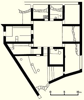 Zemin kat, arka tarafta keskince iner ve böylece geniş bir bodrum katına yer açar. Bu, tonozlu taş çatı ile örtülmüştür ve bir oda ve dar, yüksek tavanlı ve çoğunlukla aydınlanmayan koridorlu labirenttir. Bodrum katının tamamı belki de sadece depo vazifesini görüyordu; bu da buranın bir tüccarın evi olabileceği savını destekler.