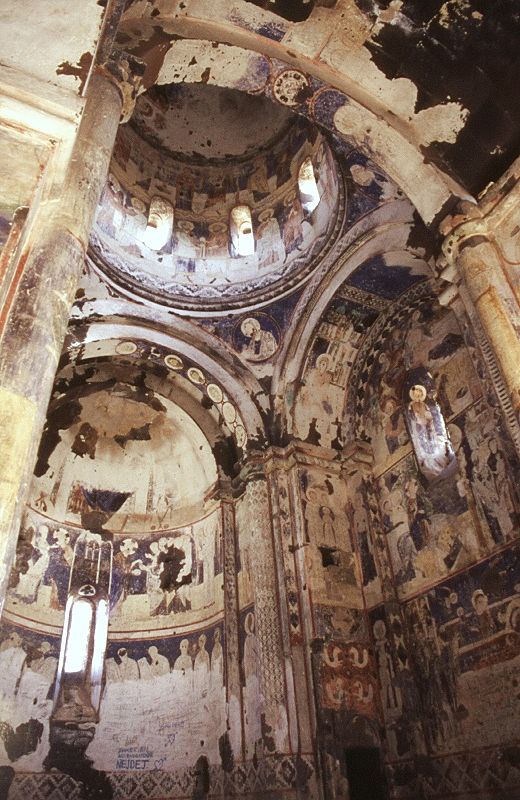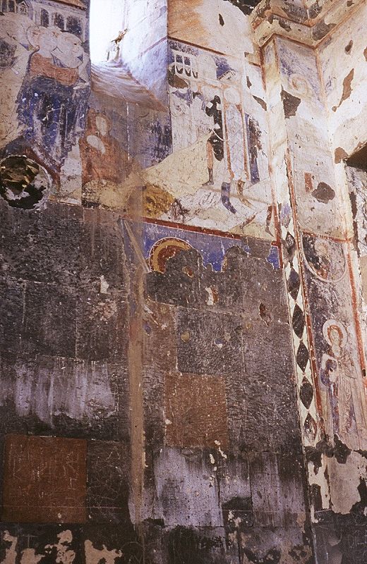 Design AnalysisFrom the outside, the domed rectangular design resembles the cathedral - but on a smaller scale. The interior plan is different and is similar to other churches from this later medieval period. It is of a type sometimes classed as a "domed hall" - a single nave partitioned into three sections with a dome over the central section.![]() The FrescoesThe interior is entirely covered with frescoes of the same date as the church. They have two main themes - the Life of Christ and the Life of Saint Gregory the Illuminator (to whom the church was dedicated). The dome contains a damaged depiction of the Ascension in the form of a bust of Christ carried by four angels, underneath which are shown Mary and the twelve Apostles. The eastern half of the church contains scenes from the life of Christ - including the Annunciation; the Nativity; the entrance to Jerusalem; the raising of Lazarus; etc. In the semidome of the apse is a figure of Christ, below this is a depiction of Christ in Communion with his Apostles, below this again is a row of bishops or prophets (these have been recently destroyed by whitewash). The western chamber of the church contains 16 scenes from the life of Saint Gregory the Illuminator - including his trial before king Trdat; the various tortures inflicted upon him (including his imprisonment in a pit); the martyrdom of St. Hripsime; the baptism of King Trdat and the kings of Georgia, Abkhazia, and Caucasian Albania; etc. Above the door to the chapel south of the apse is an unusual panel containing motifs that evoke silk textile designs of that time. Four linked medallions each enclose a simurgh, a mythical lion-headed bird from Persian legend. As mentioned earlier, the narthex also contained frescoes - these are mostly now destroyed or badly damaged due to weathering. They are from a slightly later period than those in the church, and are different in style, having a finer and more Byzantine character to them. On the exterior wall of the church, above and to the right of the entrance, is a depiction of the Crucifixion. The Lamentation of Mary is depicted on the other side. On the north wall of the narthex is a now very faded image of Paradise, with Isaac, Jacob, Abraham, Mary, Adam, and a Tetramorph creature guarding the Gate of Heaven. There are also figures of saints or prophets on the underside of the arches. | ![]() |