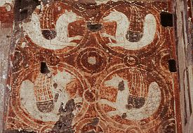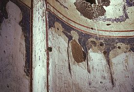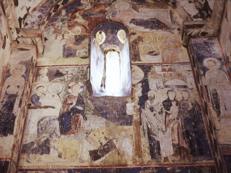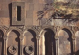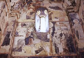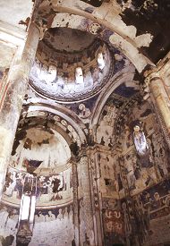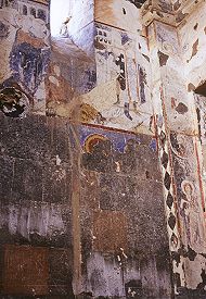 Kilisenin (özellikle içinde ve kubbenin üzerindeki dikçe sivrilen konik çatıda görülen) artırılmış dikey orantıları da bu döneme özgüdür. Kör kemer dizisi, kilisenin dört yanından dolanır. Sarmaşık bitkilerin arasından beliren gerçek veyahut hayali hayvanları betimleyen gösterişli oymalar sıra kemerlerin arasındaki kemer üstü dolgularını süsler. Bunlar, binanın tamamını saran bir süslü bant oluşturur. Benzeri kemer sırası ve bant, alnın etrafında da vardır. Bandın üzerinde bir bant daha vardır, bu da geometrik kabartmalı-oymalı işlidir (ki bu da gene 13üncü yüzyıl kiliselerine hastır). Kilisenin önünde, şimdi bayağı harap durumda, daha sonra ilave edilmiş bir narteks durur. İki taraftan açıkmış ve kuzey kenarında bir şapeli varmış. Bunun kemerli açıklıkları, keskince oyulmuş zikzak silmeyle vurgulanmıştır ve zamanının Müslüman yapılarınınkine benzer sütun başlıklarına oturtulmuştur. Bu narteksin içi (kilisenin yüzü dahil olmak üzere), fresklerle kaplıymış; bu da Ani'nin daha eski yapılarının katı sadeliklerine zıt kaçan bir teşhirciliktir ve şehrin 13üncü yüzyıl istikrarsız ekonomik ve siyasi durumu göz önünde bulundurulduğunda pek de münasip değildir. Tigran Honents, genellikle ticaretle uğraşarak büyük servetler toplayan ve kendilerini "baron" ilan eden birçok varlıklı tüccar ailelerden birinin üyesiymiş. Varlıklı olmalarına rağmen, sonunda kendi konumlarını da Ani'ninkini de koruyabilecek yeterli siyasi ve hiçbir askeri güçleri olmamıştır. Fresklerİç mekanın tamamı, kiliseyle aynı yaşıt fresklerle kaplıdır. İki ana konu vardır - Hazreti İsa'nın Hayatı ve kilisenin adandığı Krikor Lusavoriç'in Hayatı (Saint Gregory the Illuminator).Kubbe, altında Azize Meryem ile On İki Havarinin bulundurulduğu, dört melek tarafından taşınan İsa büstü ile İsa'nın Göğe Yükselişi'nin hasar görmüş tasvirini barındırır. Kilisenin doğu yarısı, aralarında Cebrail'in Hazreti Meryem'e Haber Verişi ("Annunciation"), İsa'nın Doğumu, İsa'nın Kudüs'e Girişi, Aziz Lazarus'un Dirilme Mucizesi, vb. sahnelerinin de bulunduğu, İsa'nın hayatından sahnelerle donatılmıştır. Apsisin yarım kubbesinde, İsa'nın figürü vardır. Bunun altında İsa ve Havariler, Aşai Rabbani ("Communion") sahnesinde resmedilmiştir. Bunun da altında, yakın geçmişte badana ile mahvedilmiş bir sıra kilise büyükleri veyahut peygamber resimleri varmış. Kilisenin batı odası, Krikor Lusavoriç'in hayatından 16 sahne sunar. Aziz Krikor'un Trdat tarafından yargılanması; zindan dahil, ona çektirilen işkenceler; Hripsime'nin ehit edilmesi; Kral Trdat ve Gürcistan, Abhazya, ve Albanya krallarının vaftiz edilmesi; vs. de bunların arasında yer alır. Apsisin güneyindeki apelin kapısının üzerinde, zamanının dokumacılığına fikir verecek bir desen olarak, madalyonlar içinde mahfuz dört ejderha gösteren sıra dışı bir aynalık vardır. Daha önce de anlatıldığı gibi, nartekste de freskler varmış. Bunlar, artık mahvolmuştur veyahut aşınmayla zarar görmüştür. Kilisenin duvarında, girişin üstünde ve sağında, İsa'nın çarmıha gerilişi resmedilmiştir. Azize Meryem'in yası öbür taraftadır. Narteksin kuzey duvarında artık epey solmuş, İshak, Yakup ve İbrahim peygamberlin, Hazreti Meryem, Adem ve Cennet Kapısı'nı bekleyen dört şekilli ("tetramorph") yaratığın gösterildiği Cennet resmi vardır. Kemerlerin altlarında da aziz veya peygamber figürleri vardır. | ![]() |