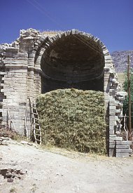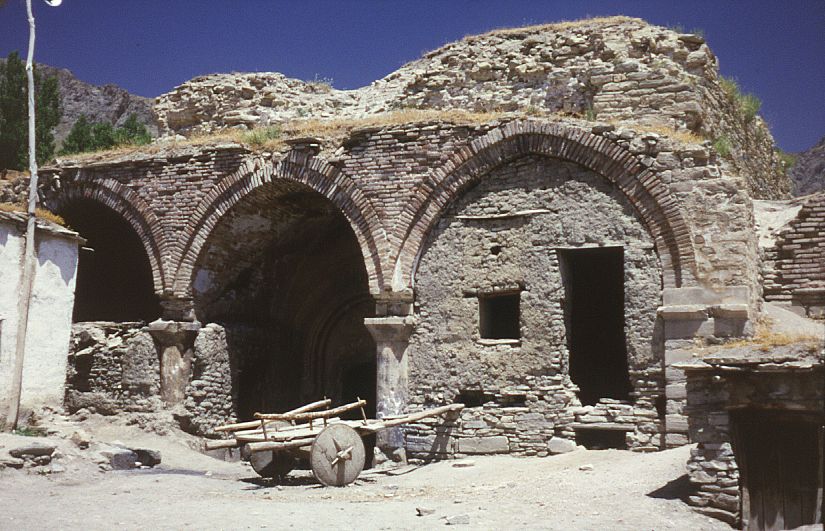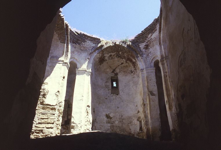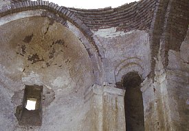 The walls are surprisingly crudely built: rubble masonry behind a thick layer of plaster. The vaults, with pointed arches, and upper part of the walls are of brick. There was a dome over the central space. This was also built of brick and was supported by a brick drum, cylindrical inside and dodecagonal outside.