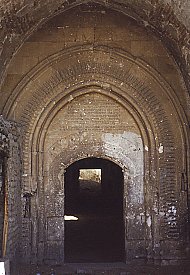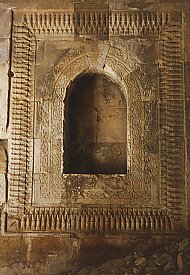 West of the church of the Holy Mother of God is a large hall, (4), called a zhamatun in Armenian. An inscription over its door records that it was built in 1648 by the architect Tiratur. It probably replaced an older structure destroyed in the earthquake of that year. It is a square structure, 14 by 14 metres, built of well cut stone, and divided into 9 bays. The roof over the centre bay had a dome over a tall, octagonal drum. The roofs over the other 8 bays have domed vaults resting on pendentives. The doorway from the zhamatun into the church is particularly ornately decorated, using a mixture of Armenian, Turkish, and Persian motifs.