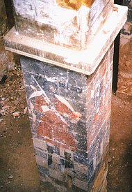 The free-standing and engaged pillars inside the zhamatun have frescoes depicting, amongst others, St. Hrip’sime, St. Gayane, the archangels Michael and Gabriel, various other saints, clerical figures, and the patron of the zhamatun, Kirakos. These frescoes, today in very bad condition, were once garishly coloured. A. H. Layard, after a visit in 1850, wrote "Its walls are covered with pictures as primitive in design as execution. There is a victorious St. George blowing out the brains of a formidable dragon with a bright brass blunderbuss, and saints, attired in the traditionary garments of Europe, performing extravagant miracles". The frescoes are thought, on stylistic grounds, to have been painted by an Armenian from Persia.