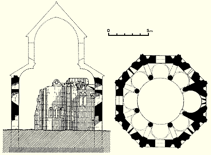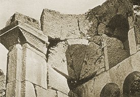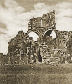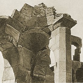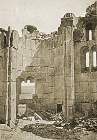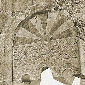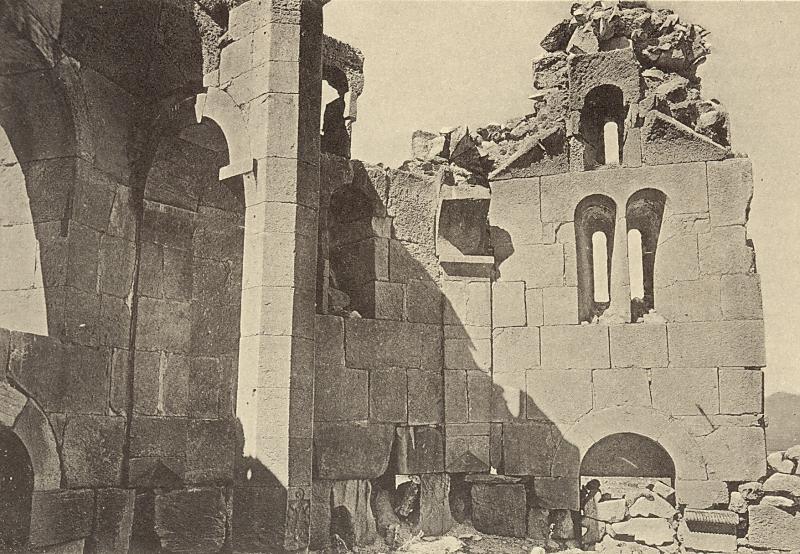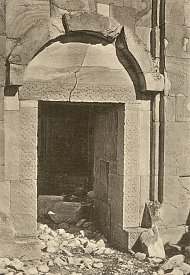 The church was eight-sided externally. Each side was approximately 4.7 metres wide, and the walls were about 0.95 metres thick. Each side was cut into by two v-shaped niches. In the inner angle of each v-shaped niche was a colonnette with a ropework pattern. Flanking each v-shaped niche was a strip of twin, reed-like mouldings. Each twin moulding ran up the façade to about the height of the top of the niche, and then linked together. An identical single moulding in the form of a blind arch descended to meet and intertwine with the linked mouldings, forming a sort of knot-work capital. It then arched upward again to intertwine with the next twin moulding, eventually encircling the whole church. There were three entrances to the church - in the north, south, and west walls. These were 1.15 metres wide and had flat lintels constructed from a series of seven interlocking, zigzag-shaped voussoirs. In Bachmann's time there was debris of about a metre thick that buried the doors up to about two thirds of their height. The church was built of limestone that had a beautiful golden-yellow colour and was extremely well cut. The limestone faced a core of rubble concrete. Internally, the church had a radiating plan, with eight apses. Such plans have been used in Armenia from the seventh century onward, but what made the design of the Varzahan octagon unique was that the normally solid walls between the apses were replaced by octagonal, free-standing, pillars. There were originally six such pillars, and only the walls of the eastern apse were solid. This had the effect of creating an ambulatory that ran around a central circular space that was 5.7 metres in diameter. At the top of each pillar was a pilaster capital. The pillars would have supported a domed roof, probably with a drum pierced by windows. Each of the eight apses had a vault comprising a 3/4-dome. Each dome rested on two small squinches. In turn, these squinches rested partly on the outer wall and partly on the arches that linked the free-standing pillars to the outer wall. The altar apse was lit by three rectangular windows placed side by side, with a porthole window above. A single block of stone acted as the lintel for all three windows. Externally, it had rope-work decoration and above it was a sunburst rosette made from stones that were coloured alternately yellow and green. There was a similar marquetry decoration over the south entrance. In each of the other apses there was a pair of rectangular windows, above which was a single, slightly smaller, rectangular window. The number of windows in this church far exceeded the number normally found in Armenian churches. There were traces of frescoes within the church: on the south-east wall Bachmann noted a series of gracefully painted heads of saints. These frescoes were more extensive when Layard visited the church. He found the interior "covered with the remains of elaborate frescoes representing scripture events and national saints" and saw in their vivid colours and elegant forms a similarity to late-Byzantine frescoes in Trebizond. However, it is unlikely that these frescoes were contemporary with the church's construction. The Date of the Varzahan ChurchesThere were no inscriptions on any the churches to give a clue as to their date of construction. Dating the buildings on stylistic grounds is also difficult. If an early eleventh century date is chosen, then many of their features seem to be from an earlier period, and other features seem too advanced for that period. There is also the problem that Varzahan is a border area and the design of the churches could have been influenced by Georgian and Byzantine architecture as well as by native Armenian architecture.Bachmann dated the octagonal church to sometime after the end of the eleventh century. Given the chaos that reigned throughout eastern Anatolia in the aftermath of the Seljuk invasions, a late eleventh or early twelfth century date is unlikely. However, it is known that Bayburt had an Armenian mayor at the end of the twelfth century. He composed a book of sermons and was later killed by the Muslim emir of the town, who governed the place on behalf of the Salkutids of Erzurum. This suggests that the majority Christian Armenian population still held a degree of autonomy and political power, circumstances that would have been necessary for the construction of the Varzahan churches. The lintel of interlocking voussoirs over the entrance to the octagonal church is a feature also found on many Seljuk buildings. Before its capture by the Salkutid dynasty of Seljuk Turks at the end of the eleventh century, Bayburt had been under the control of the Byzantine Empire for many centuries (perhaps since the year 387). So it is also possible that the churches date from towards the end of the period of Byzantine rule. Having three windows in an apse is a feature that is seen only in very early Armenian churches - but is common in Byzantine Greek churches. The octagonal drum of the cross-shaped church was an archaic form by the eleventh century - by then most drums were circular. Thierry has noted similarities to the Varzahan octagon in the basilica of Erkan, in Tunceli district, probably built in the 970s. Some elements of their design may indicate a Georgian influence. For example, the use of differently coloured stone slabs to make decorative panels is common in Georgian churches from the tenth and eleventh centuries within the Tao-Klardjeti region, which was only a short distance to the east of Varzahan. The truth is that throughout the vast Erzurum, Erzincan, and Bayburt regions almost nothing is known about the architecture of the medieval Armenian churches that once existed there. Almost everything that had survived the centuries of wars and earthquakes was destroyed as part of Turkey's post-genocide policy of eliminating the evidence of Armenian presence in these regions. The little that remains are either nineteenth-century village