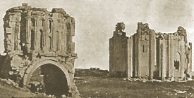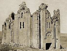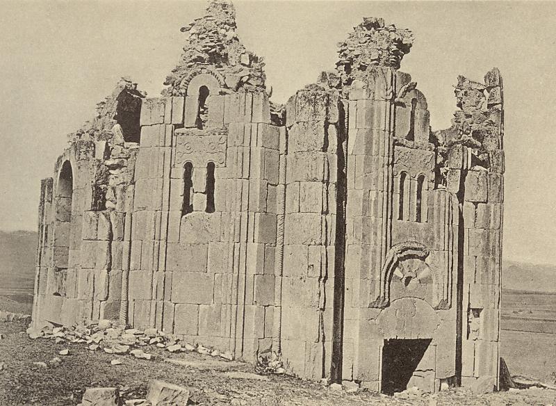 A Treatise on the Geology of Armenia London, 1906, pages 35-36 and 239 The Architecture of the ChurchesThe Varzahan churches were demolished sometime between the 1920s and the mid-1950s ¹. The destruction was total: nothing now remains on the site, not even a single stone. Fortunately, the German archaeologist Walter Bachmann had taken a series of photographs of the churches in 1911 and had also surveyed the octagonal church ². He observed at Varzahan the remains of three churches in total, but mentioned that according to local Armenian tradition the place used to have over 200 churches. Although dismissing that tradition as an obvious exaggeration, Bachmann did notice traces of ruined buildings spread out over a wide area, indicating that a much larger settlement had once existed at Varzahan.There were two churches standing close together: a domed church with a cross-shaped plan, and a church with an octagonal plan (the "Surp Khatch" mentioned by Oswald). The very ruinous remains of a third church stood a short distance away. Bachmann's photographs of the cross-shaped church show that its walls were decorated by blind arcades. The drum of the dome was eight-sided externally, and pierced by a window on each side. There was a narthex or zhamatun built against the west facade, and the remains of a porch in front of the north entrance. Bachmann did not published photographs of the very ruinous church. However, a photograph in Strzygowski's "Die Baukunst der Armenier und Europa" shows part of it. It is difficult to know exactly what part of the church is being depicted, but the articulation of the stonework seems similar to that found on brick-built Byzantine churches. Close to the churches was an old graveyard that contained gravestones shaped like rams. Others were shaped like horses, complete with saddles and bridles. This graveyard is also now destroyed. In the garden of the Erzurum archaeological museum are a selection of ram-shaped gravestones, described as being Turkish in origin, that are similar to those shown in old photographs of the Varzahan graveyard and that may have come from Varzahan. The Varzahan OctagonThe design of this building was unique in Armenian architecture.