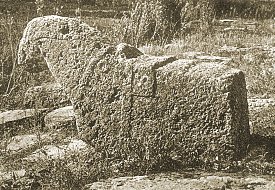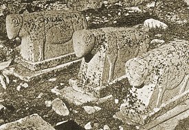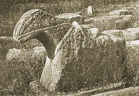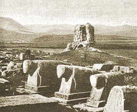 Leaving the town [Bayburt], we made our way across this upland in a direction of west to west-north-west; and, in a little over an hour, overlooked one of the flat depressions which have already been so often described. Upon its snow-clad surface was placed an Armenian village with three fine buildings, now in ruins, a relic of the old times. What an eloquent memorial those shapely forms and that finished masonry still preserved to a cultured and beneficent race! Varzahan was the name of the village; but we had again been placed under surveillance, and it was impossible to perpetuate the image of these decaying remains. But one of them has already been drawn by Layard (Nineveh and Babylon, p. 7); and I here reproduce a photograph taken during our second journey, which shows some interesting examples of old Armenian tombstones with rams' heads in the cemetery of Varzahan.