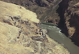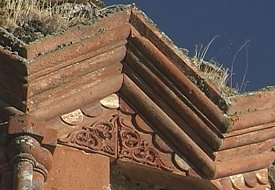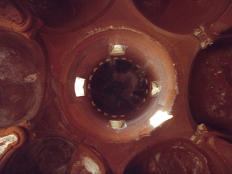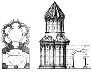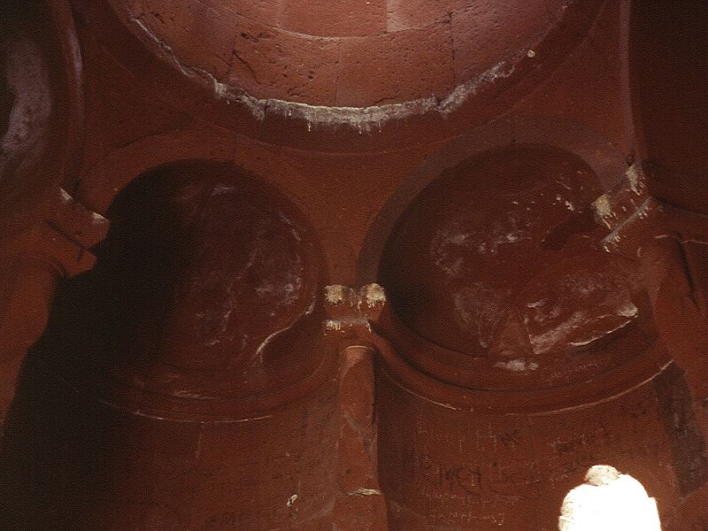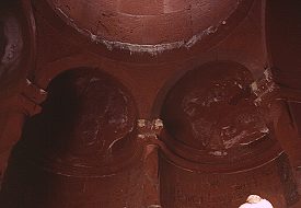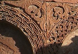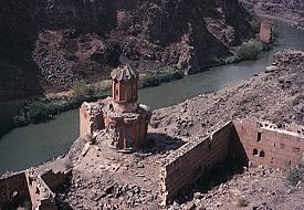 Externally, the drum of the dome is divided into twelve faces, separated by clusters of three colonnettes. Blind arcading also divides the curving external wall of each apse into three faces. Each arch of the arcade contains a different design of interlace pattern, and the spandrels between each arch are filled with a foliate ornament. As well as carved decoration, paint was used to decorate parts of the exterior: the stone still has traces of dark-red and creamy-white pigment. It is applied in a subtle way, giving the effect of tinting the stone. Sometimes it is applied directly onto plain facing stone, such as the band of rhombuses underneath the cornice of the lower roof, alternately painted light and dark to create a zigzag pattern. Sometimes it is applied onto carved elements, such as the row of half circles that run around the base of the drum and also under the triangular gables of the umbrella roof. Some of the interlace patterns on the arches of the blind arcade also show signs of having been painted. Inside the church are six tiny apses around a central circular space, above which is a miniature cupola resting on a tall, cylindrical drum. There are four windows in the drum, and another in the eastern apse. The interior is very plain, and without frescoes. The entrance is through the western apse, in front of which once stood a small porch. Abutting the church to the south is a small, rectangular, single-nave chapel with a semicircular altar apse. Although small, multi-apsed, centrally planned churches like this are found in Armenian architecture, they are unusual for this late period. Perhaps the design was influenced by Turkish "kumbet" tombs, or by the similar, but earlier, church in Bagnayr monastery. (NB: under current Turkish army restrictions, visitors to Ani are not allowed to visit the Monastery of the Virgins.) |