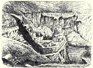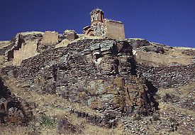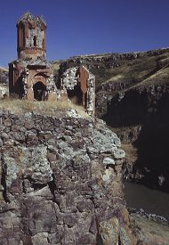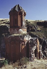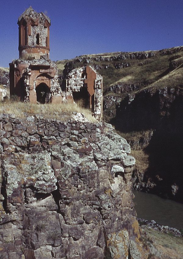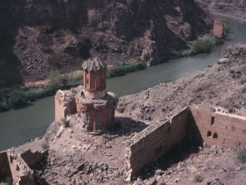 Structure: Marr-Orbeli site 92. Other designations: Virgins' Convent; Surp Hripsime; Kusanats Vank; Bekhents Vank; Kizlar Manastırı; Kutsal Rahibeler Manastırı; "Sepulchral Church". HistoryThis small monastery stands on a rocky promontory, isolated from the rest of the city and overlooking the Arpa/Akhurian River. It was named after the virgin martyrs of Saint Hripsime, and may have contained a community of nuns. Within a walled enclosure are the remains of several buildings: the most important being a tiny, slender, and very attractive chapel. The chapel contains no building inscriptions - it most probably dates from the early 13th century, but may possibly be from the first half of the 11th century. It is now an extremely picturesque ruin - a cute little building of reddish stone perched on a pinnacle of rock.An inscription on the Church of Saint Gregory of Tigran Honents mentions a nearby monastery called Bekhents, restored by Tigran Honents. It has been suggested that Bekhents was this monastery.